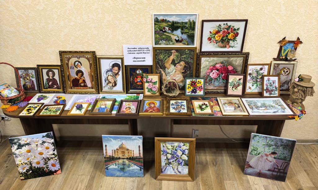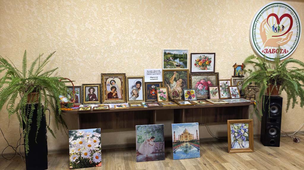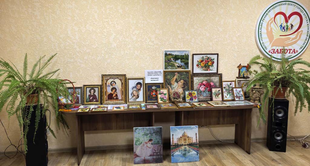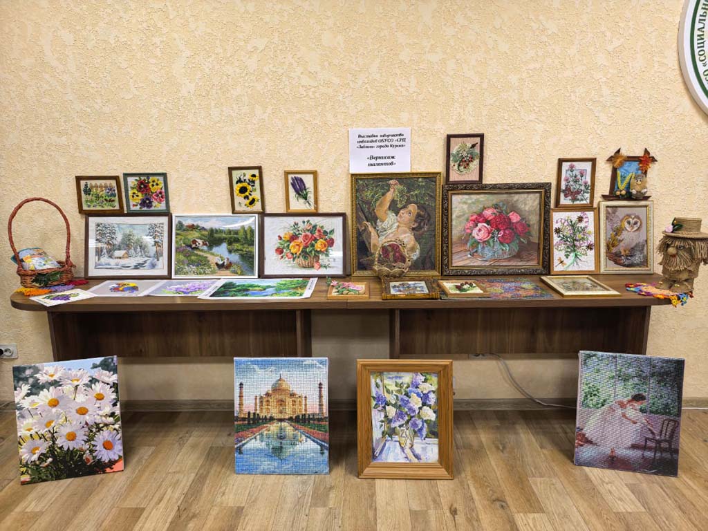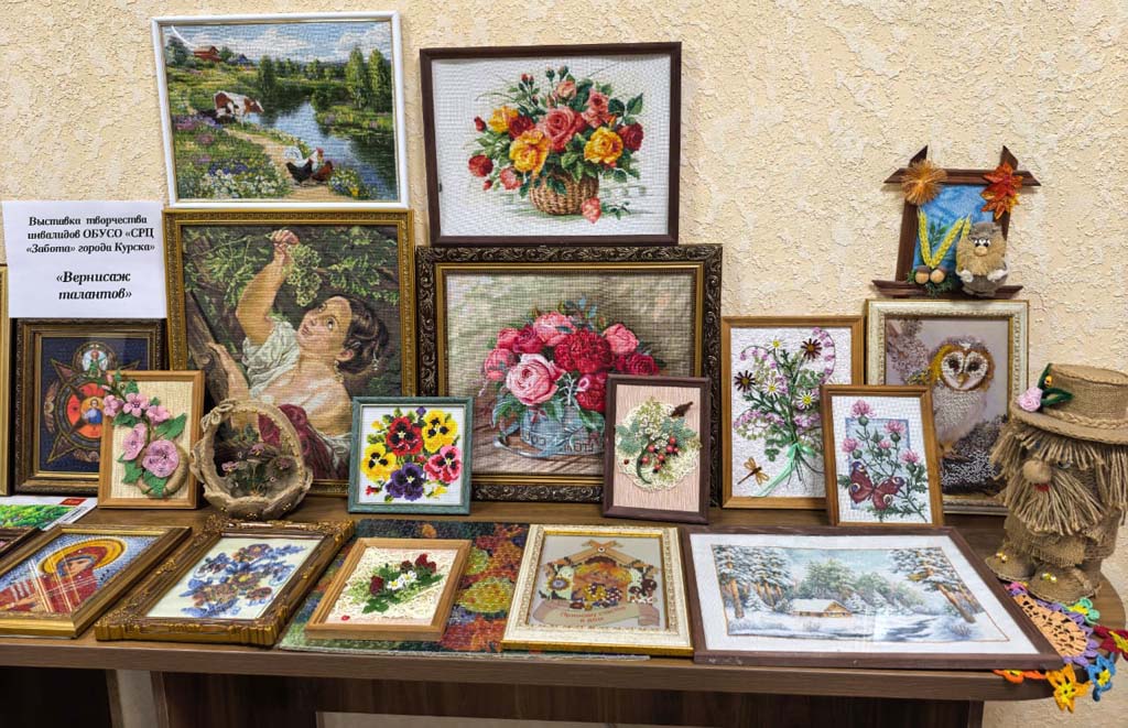 Выставка творческих работ, организованная в рамках декады инвалидов, — это замечательная возможность продемонстрировать талант и мастерство наших получателей социальных услуг. Мастерицы ОБУСО «СРЦ «Забота» города Курска»: Савенкова Т.А., Кравченко З.И., Шубина Т.А., Сорокина В.Т., Миронова О.В., Кваскова А.И., Борзенкова Г.В., Бородавченко Р.Н.  представили разнообразные изделия, такие как картины, вышитые бисером, стразами, цветными нитками, плетеные корзинки а также великолепные картины, выполненные крестиком. Кроме того, на выставке можно увидеть домовенка Кузю и картины, связанные с ним. Эти работы показывают, насколько уникальными могут быть таланты каждого человека. Старательность и креативность наших рукодельниц вдохновляют всех посетителей!
