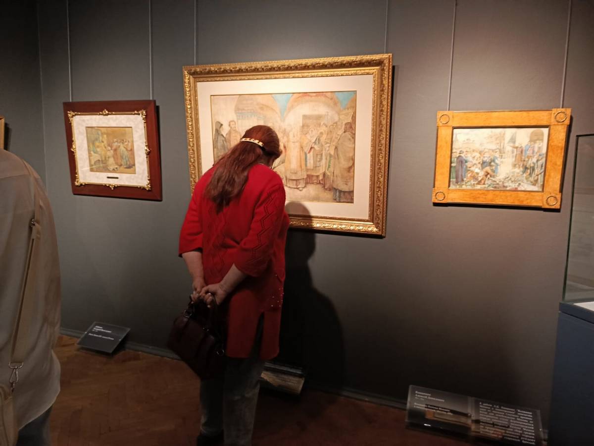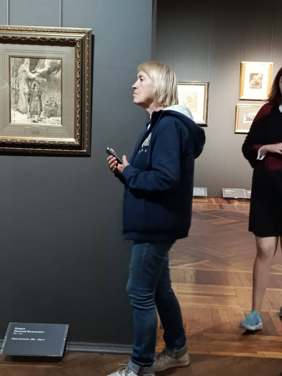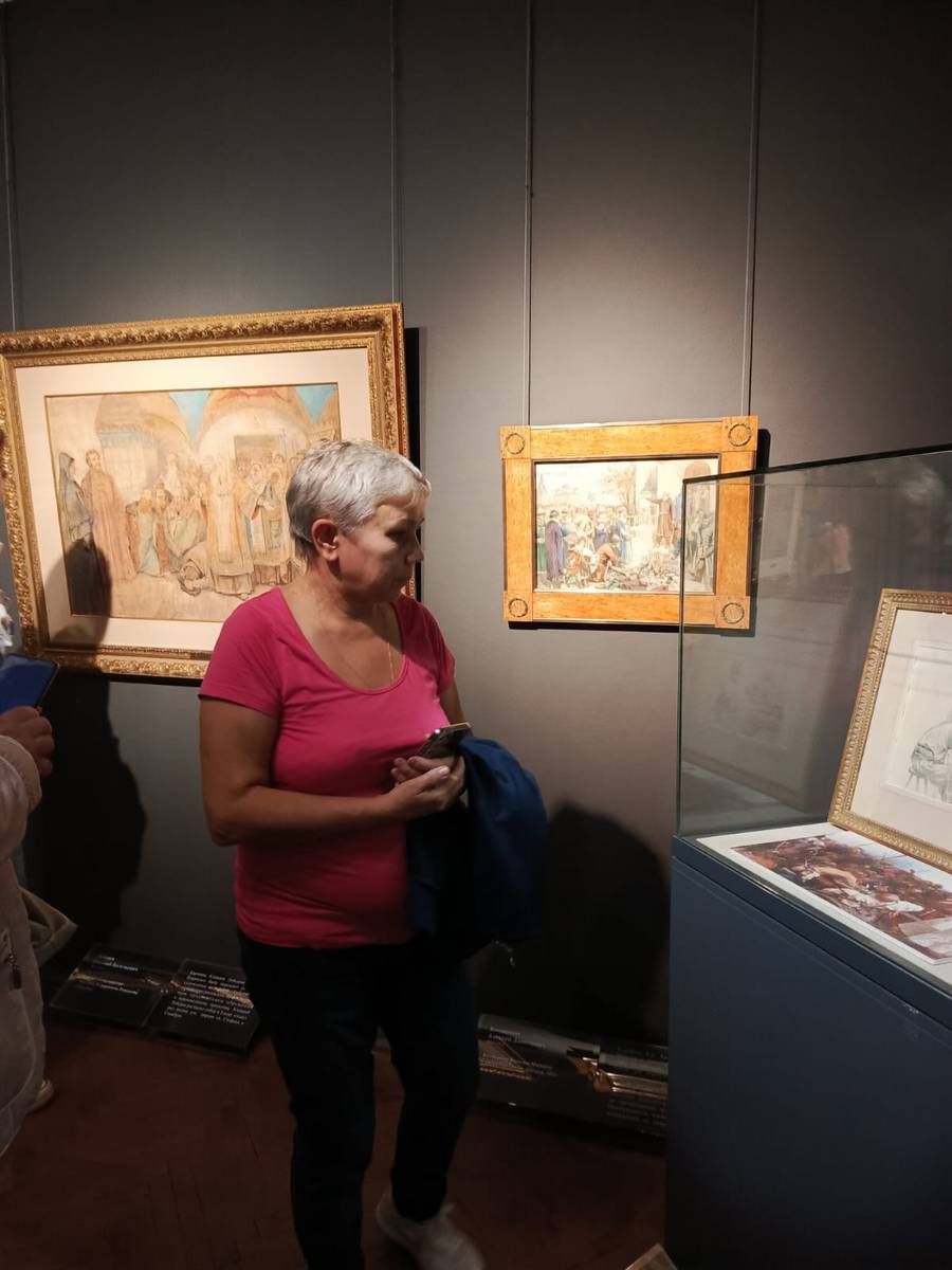 Эта выставка – редкое собрание работ мастеров XIX и XX веков из личной коллекции известного мецената Андрея Анатольевича Конькова. Участники проекта увидели подлинные работы великих художников: Ильи Репина, Виктора Васнецова, Ивана Билибина, Константина Маковского…, которые расписывали храмы Спаса Нерукотворного, Спаса –на - Крови, Киево-Печерскую лавру, Храм Христа Спасителя, Владимирский собор в Киеве. В экспозицию вошли эскизы, наброски, этюды и фрагменты картин – те самые «рабочие» материалы, которые обычно скрыты от зрителя в запасниках музеев. Именно в них часто наиболее искренне и непосредственно раскрывается творческий поиск художника, который раскрывала вместе с нами замечательный экскурсовод, влюбленный в свою профессию, Ирина Васильевна Разинькова. Каждый лист, каждый этюд – это акт сохранения национального культурного наследия.
