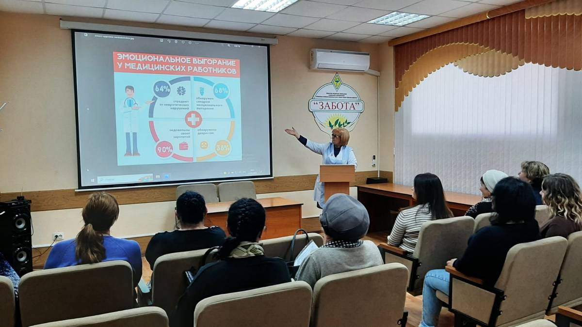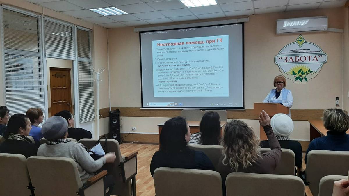 В ходе занятия были разобраны очень важные темы: «Оказание неотложной помощи при гипертоническом кризе», «Синдром выгорания у лиц, ухаживающих за больными с тяжёлыми хроническими заболеваниями».
